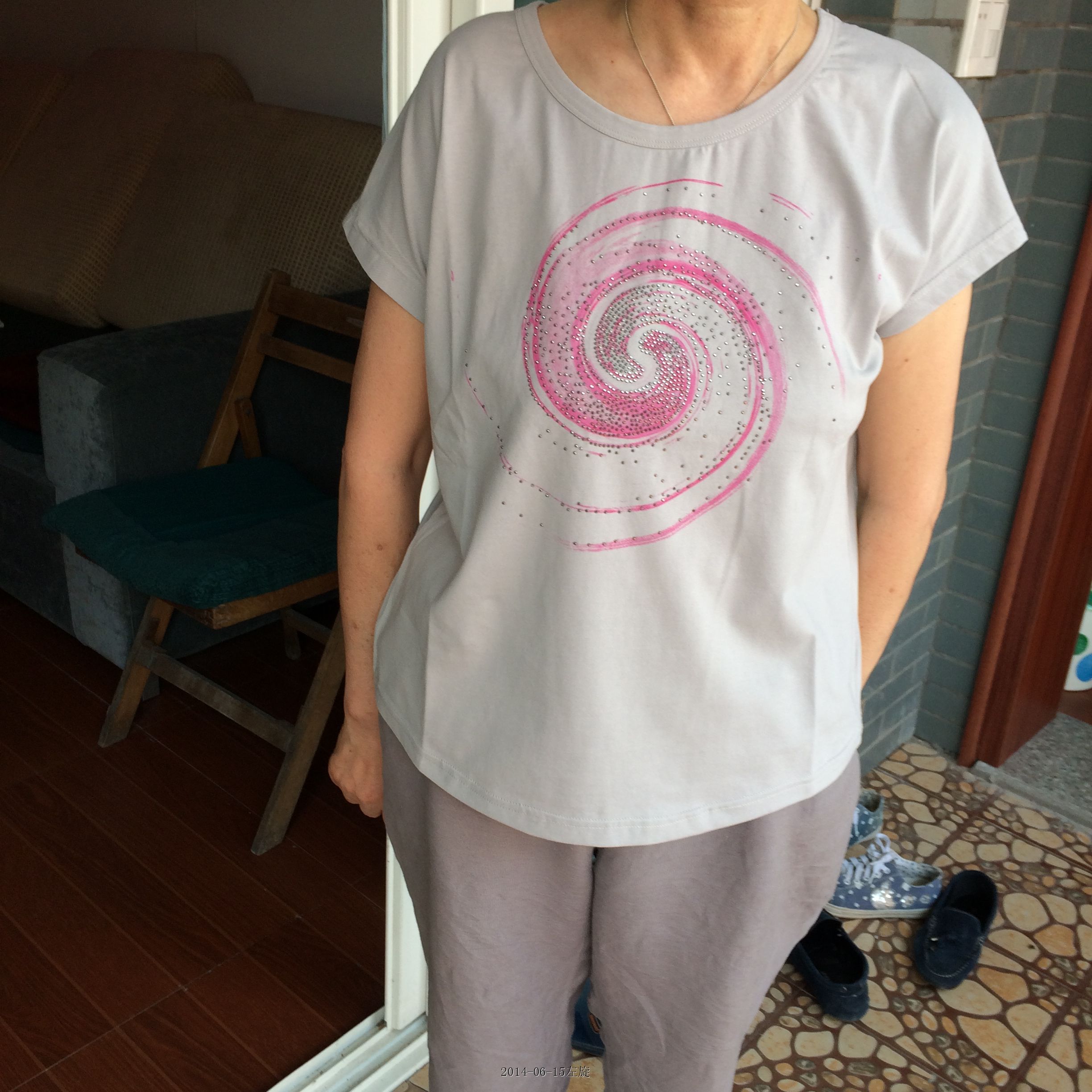 这次上市的T恤是女式的,共两个款色,8个颜色,左旋图案分宝蓝与玫红的,上面还烫钻了,非常漂亮。大小尺寸分为M/L/XL三个。连袖款色为短款,体型丰满的穿着非常合适;插肩袖的款式适合体型比较标准的女士,穿着很得体。我传几张照片给看看吧。
