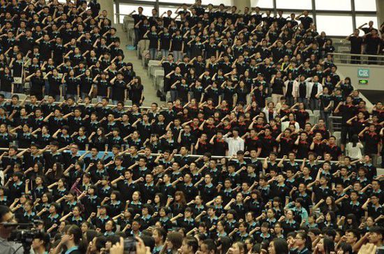 开学典礼上全体本(专)科新生面向校旗宣誓。
